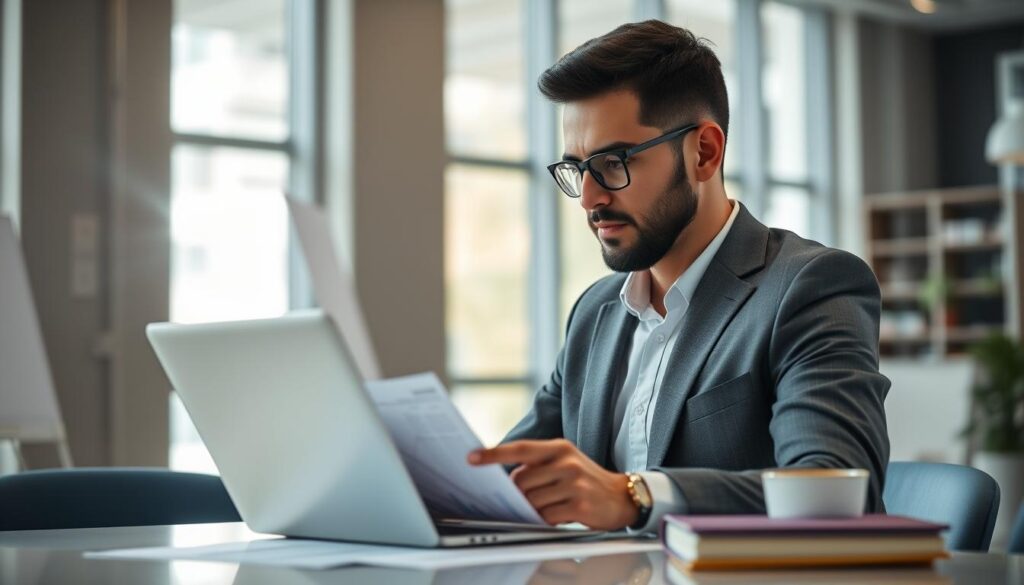 Financial business professional reviewing tax documents and financial statements